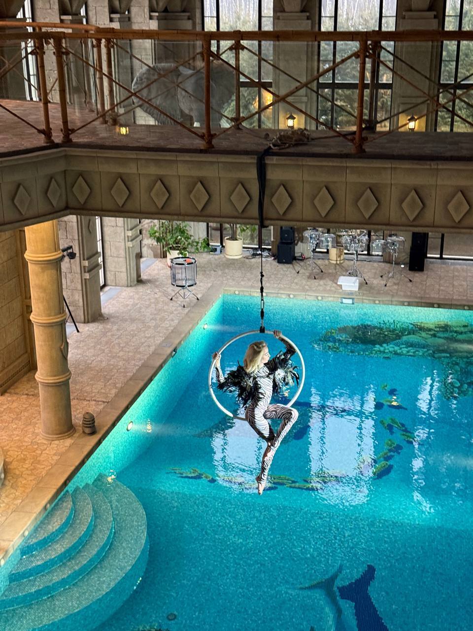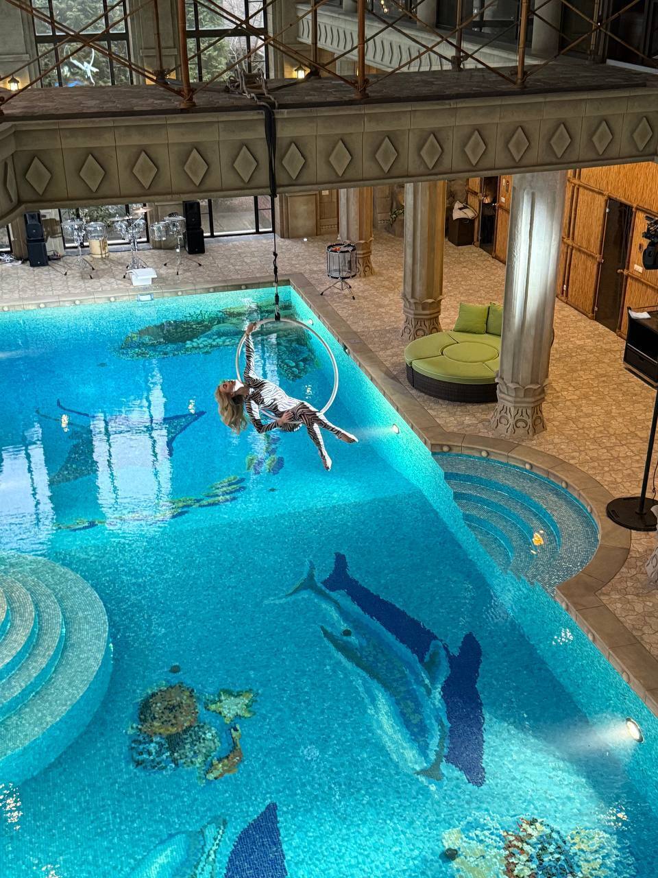 The installation of a special suspension system over the pool made the gymnast’s performance even more spectacular and safe. The performer executed complex elements that literally left guests breathless.